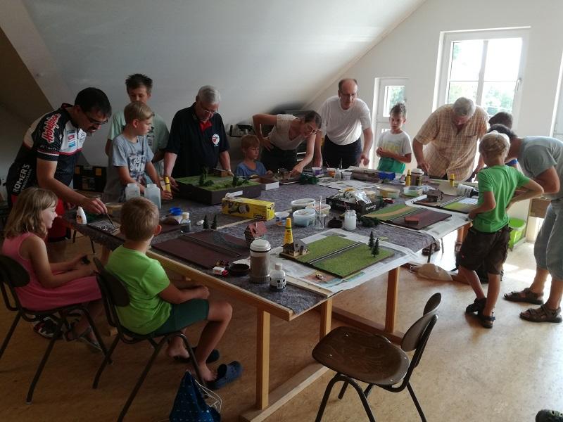Nachdem sich die Erbauer darauf einigen konnten, auf der schmalen Seite einen Wald anzulegen, ergeben die zusammengebauten Module ein einheitliches Bild. Ferienprogramm 2019Unser diesjähriger Beitrag zum Ferienprogramm am 2. August 2019 war sehr gut besucht. 14 Kinder und Jugendliche brachten uns fast in personelle Herausforderungen...